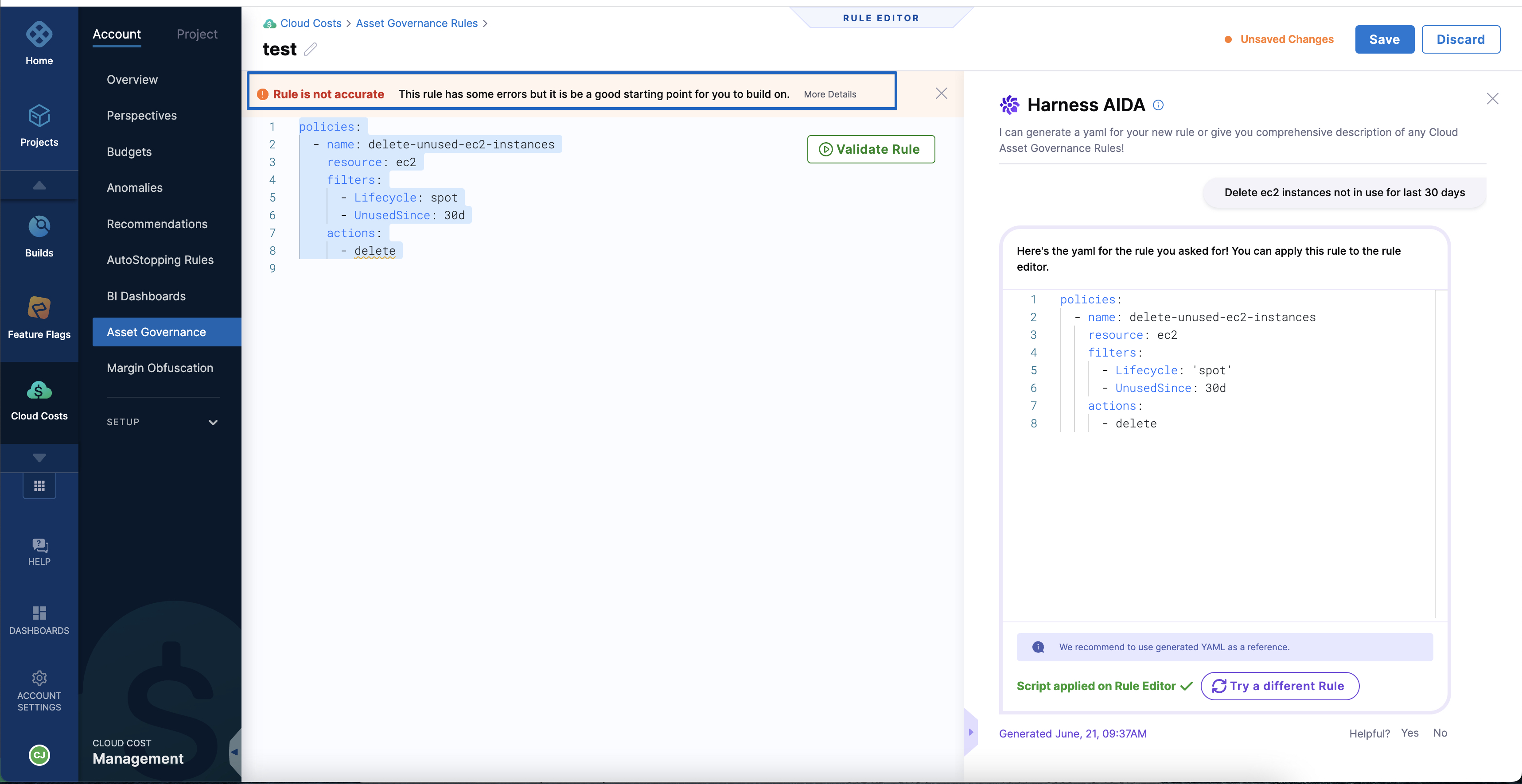 • Type your requirement and select the Return key. Alternatively, you can directly enter your governance requirement into the UI. Type your desired rule in a clear and concise manner and select the Return key. For example, you could specify a rule such as "Delete EC2 instances older than 90 days." Harness AI processes your input and generates a corresponding rule.