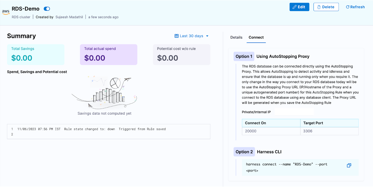 Once the rule is saved, go to the Details page of the AutoStopping rule for instructions to connect to the RDS instance.