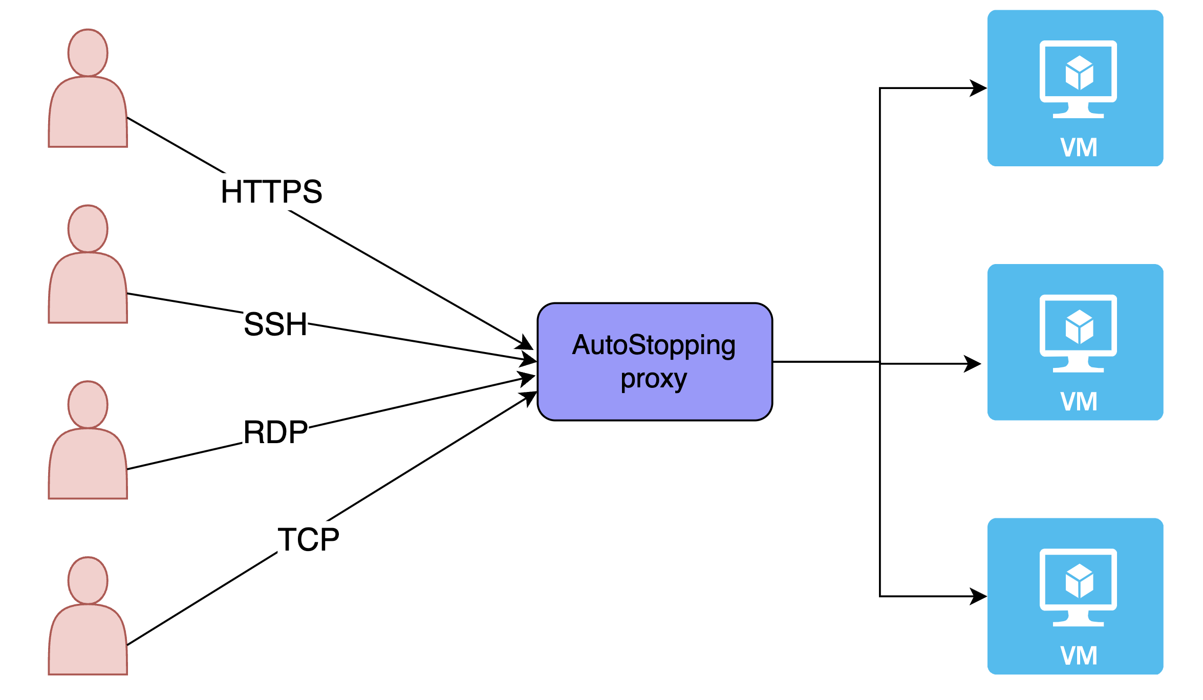 To address these use cases, AutoStopping offers a reverse proxy called the AutoStopping proxy. This proxy sits in front of the virtual machines (VMs) and manages the start and stop of the VMs based on network traffic. The proxy is capable of supporting both HTTP(S) and TCP connections.