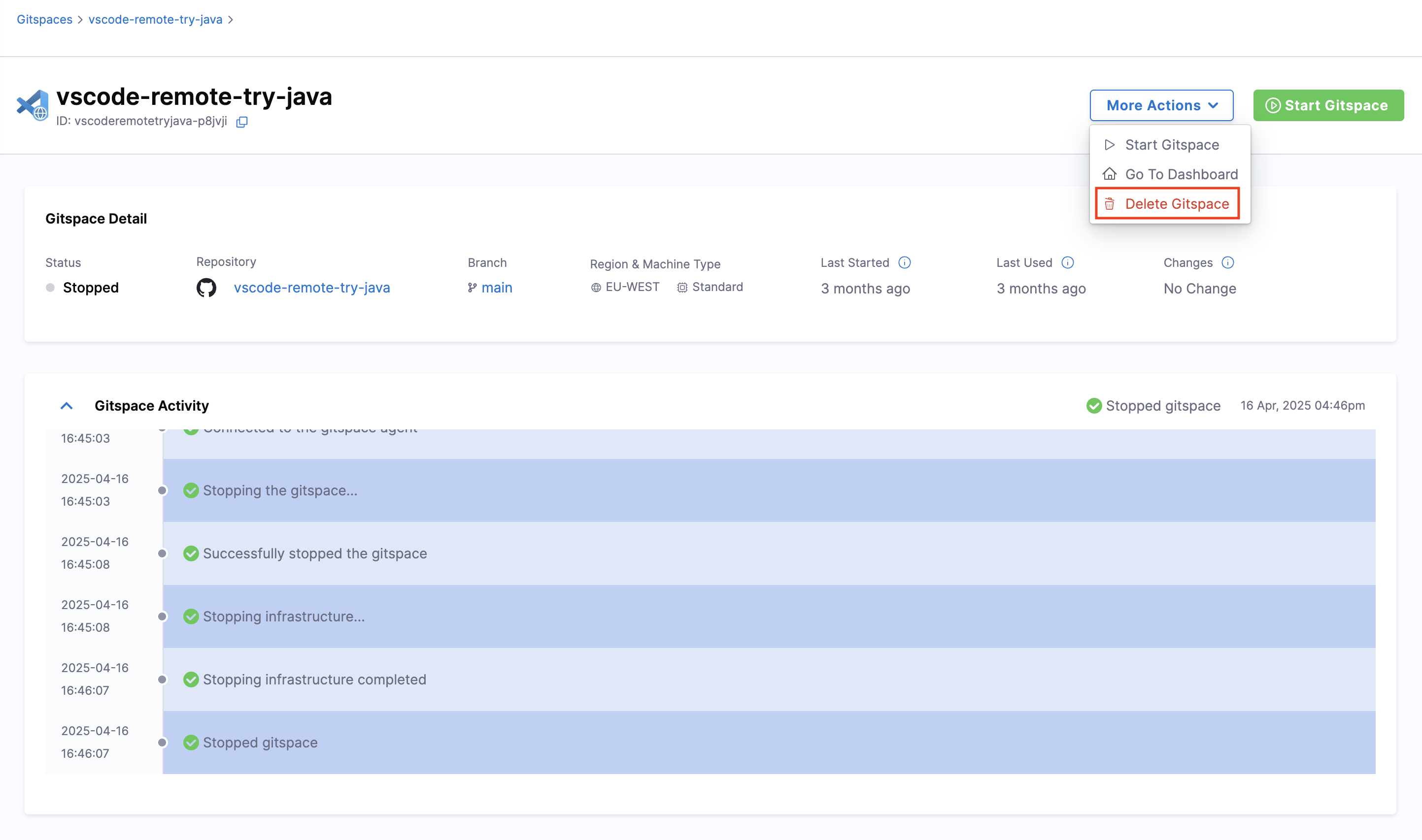 - Click and go to the Gitspace Details UI for the specific Gitspace you want to delete. Click on More Actions -> Delete Gitspace.