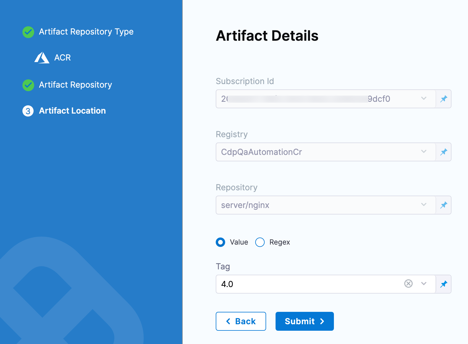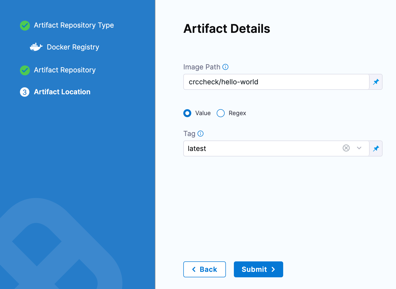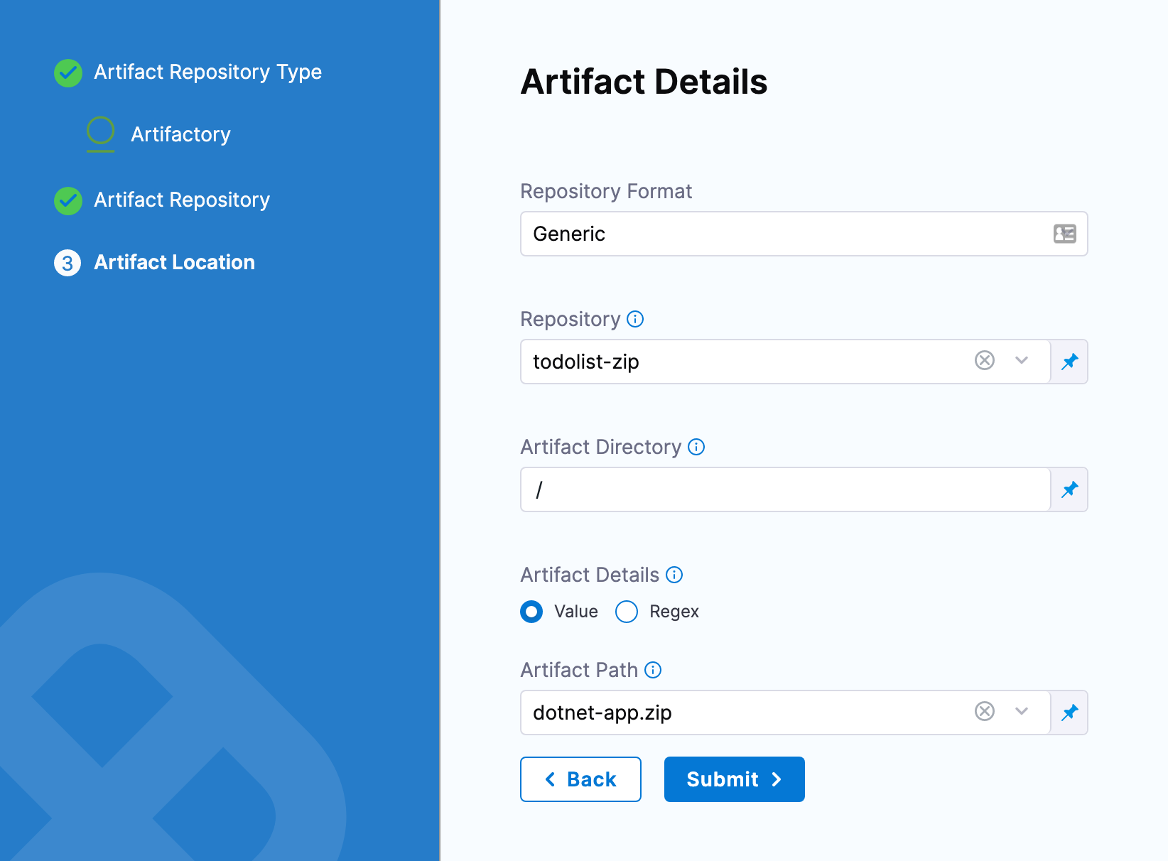 Once you have an artifact connector set up and selected, you can fill out the Artifact Details settings.