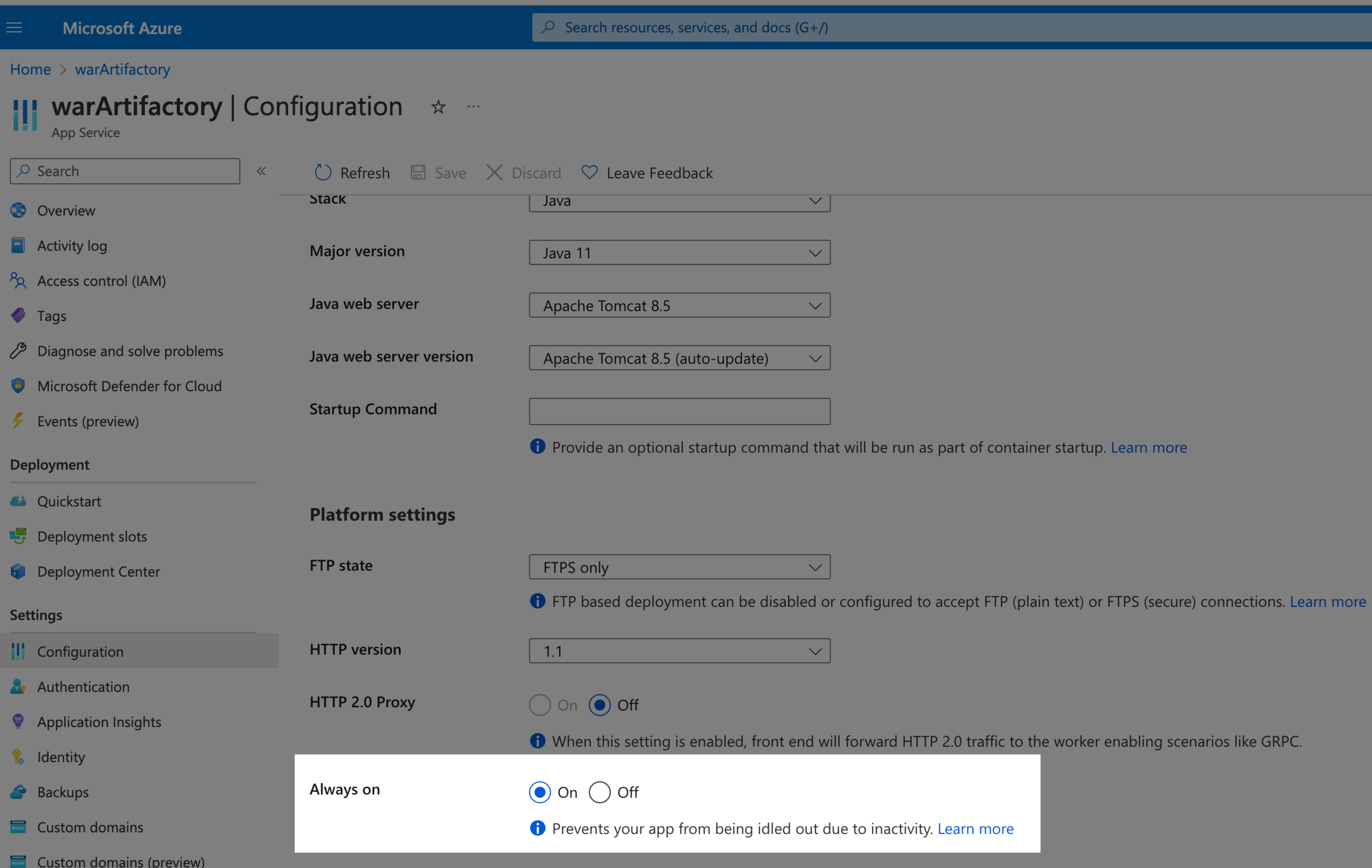 See Configure an App Service app in the Azure portal from Azure.These are the same setting you would normally set for your App using the Azure CLI: