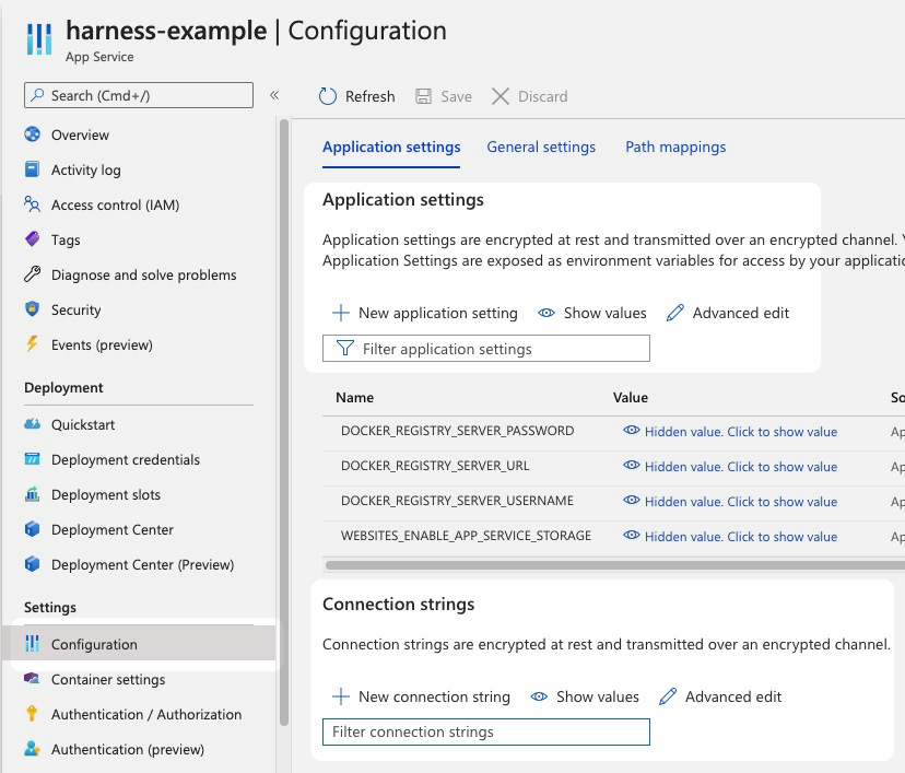 ), and the name must be unique. This is the same requirement in Azure App Services. - Do not set Docker settings in the Harness Service Application Settings and Connection Strings. Harness will override these using the Docker settings in the artifact you add to the Harness Service in Artifact.