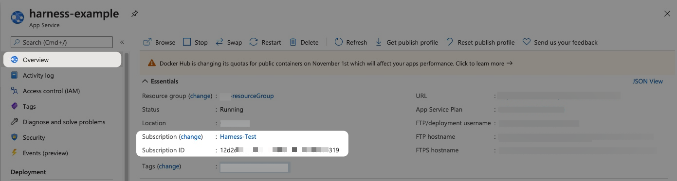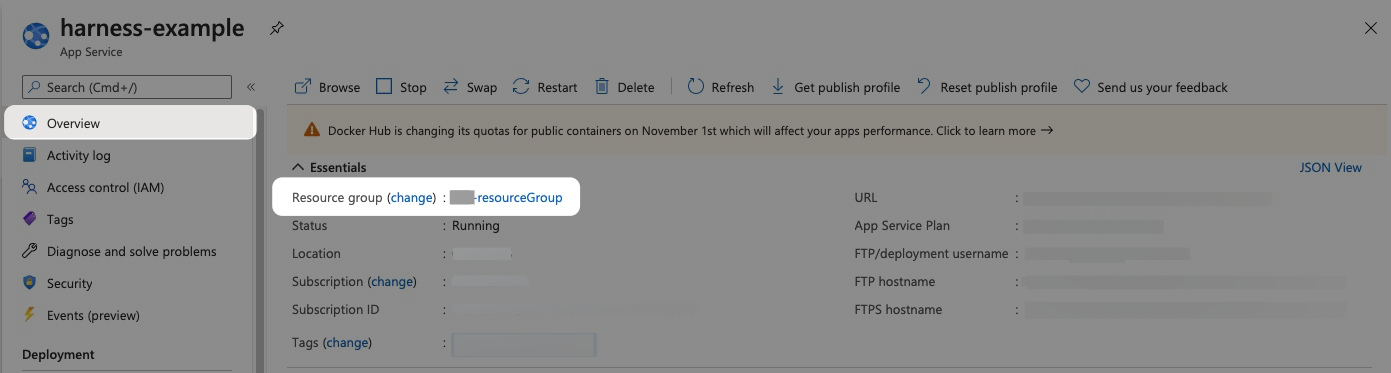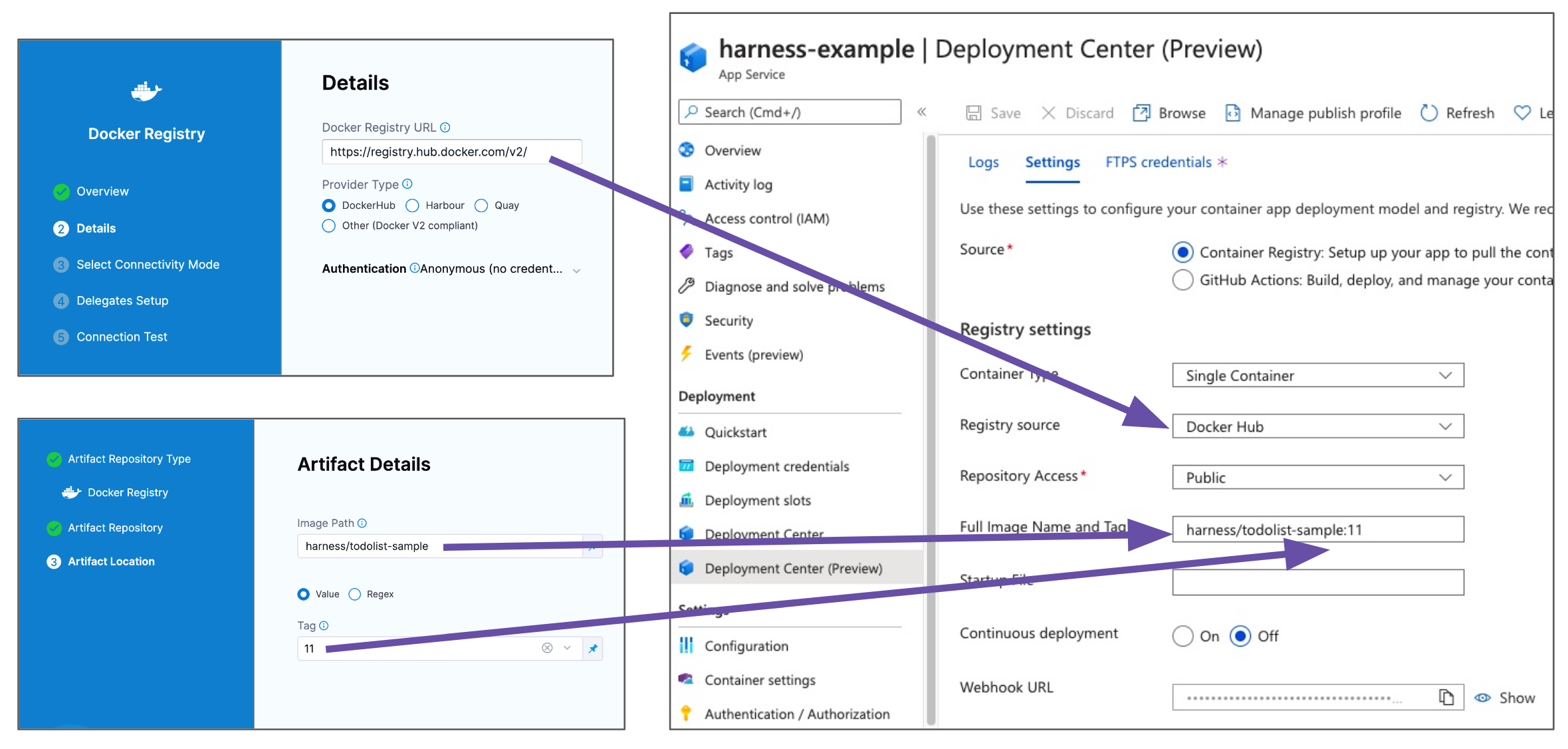 For example, here are the Docker Hub settings in Harness and an Azure Web App:
