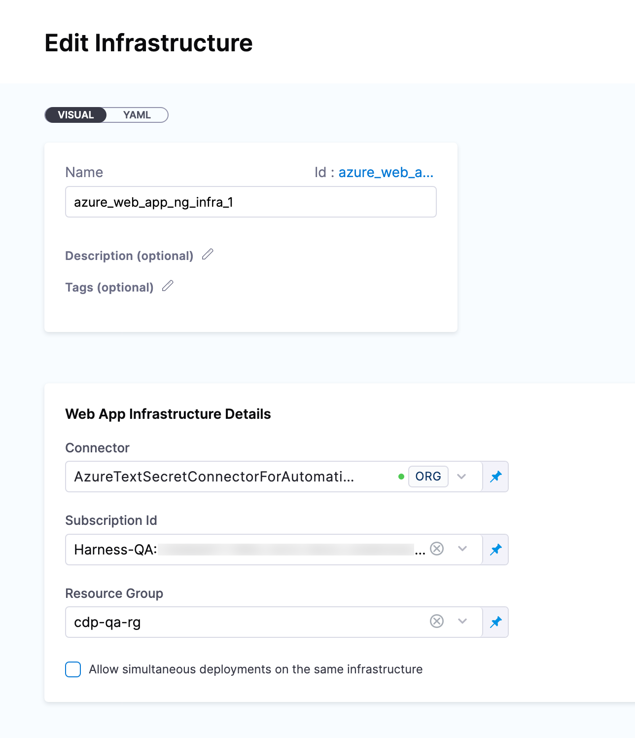 The target Azure environment for your Harness Web App deployment is defined in a Harness Environment's Infrastructure. You will provide the Web App name later in your stage's Execution.