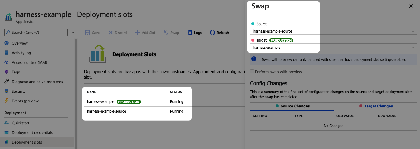 Deployment Slot: Enter the Source slot for the deployment. This slot is where Harness deploys the new Web App version.Make sure the slot you select is running. Harness shows all slots regardless of their status.