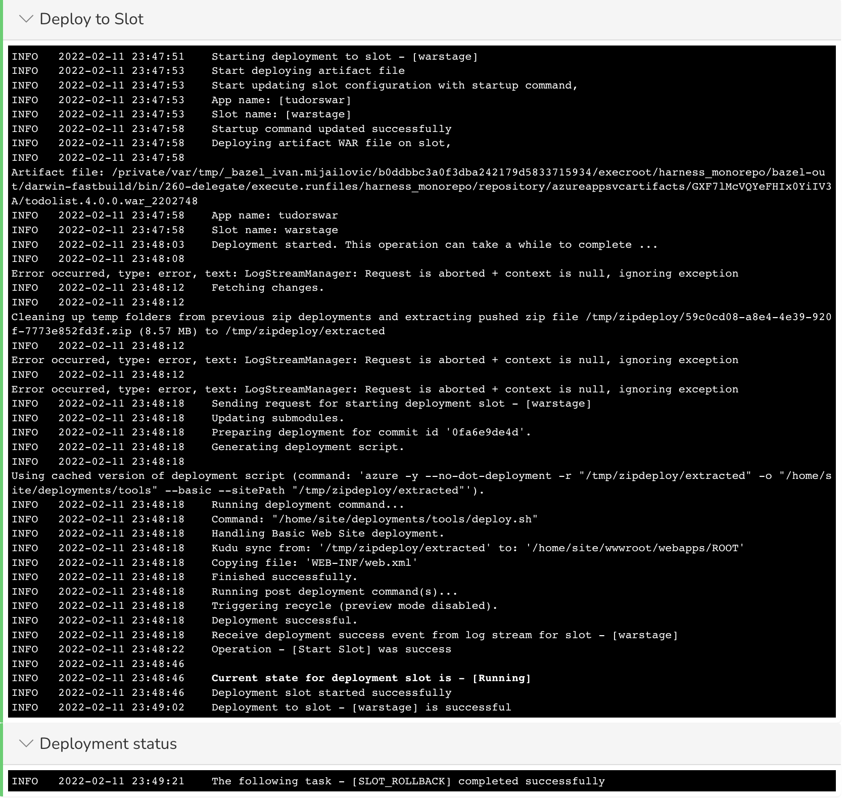 Once you run the pipeline you will see the swap in the Swap Slot step logs:
