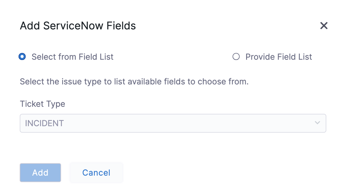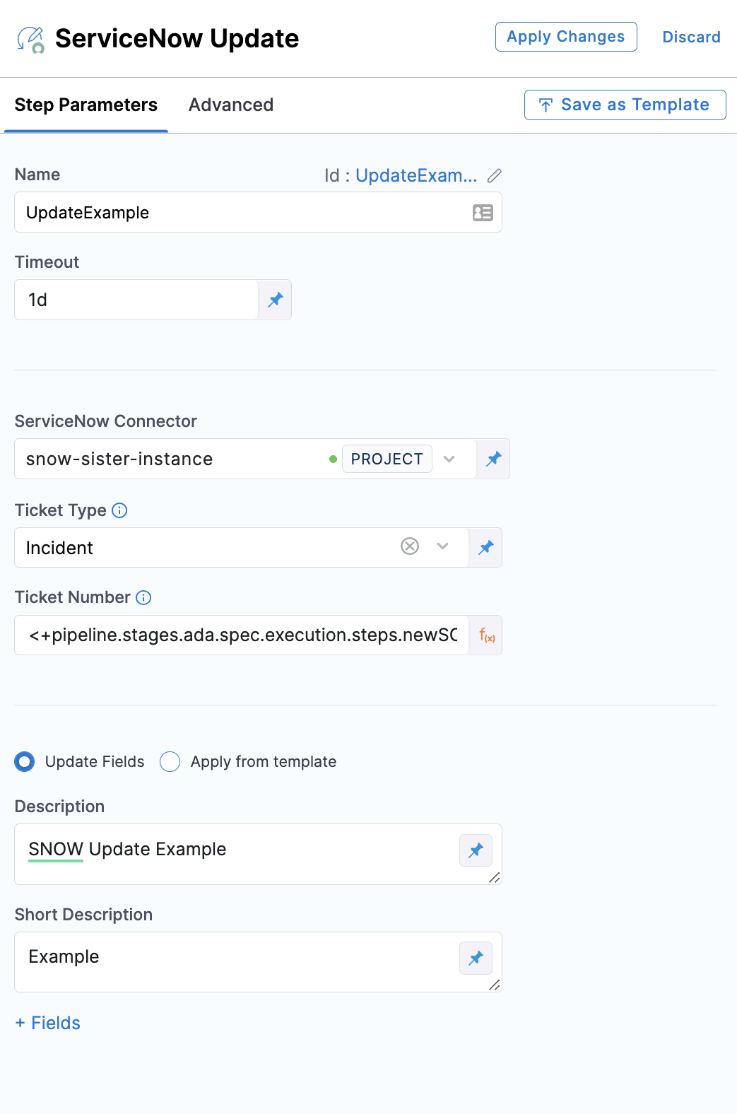 Select Update Fields to update specific ServiceNow fields in your ServiceNow ticket. This option enables you to access multiple custom fields from your ServiceNow integration.