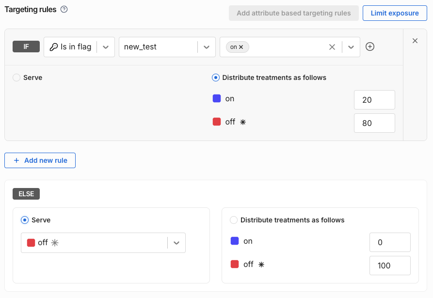 Let's say we have two feature flags with the second depending on the evaluation of the first. In this example, we would like 20% of customers who receive the on treatment for the new_test feature flag to evaluate to on for the advance_new_feed feature flag while the other 80% should evaluate to off.