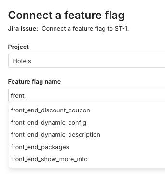 From Jira: In the right hand column of an issue, click More fields to expand the section and then Releases +. When you click the plus sign, you can either create a feature flag or connect to an existing flag.