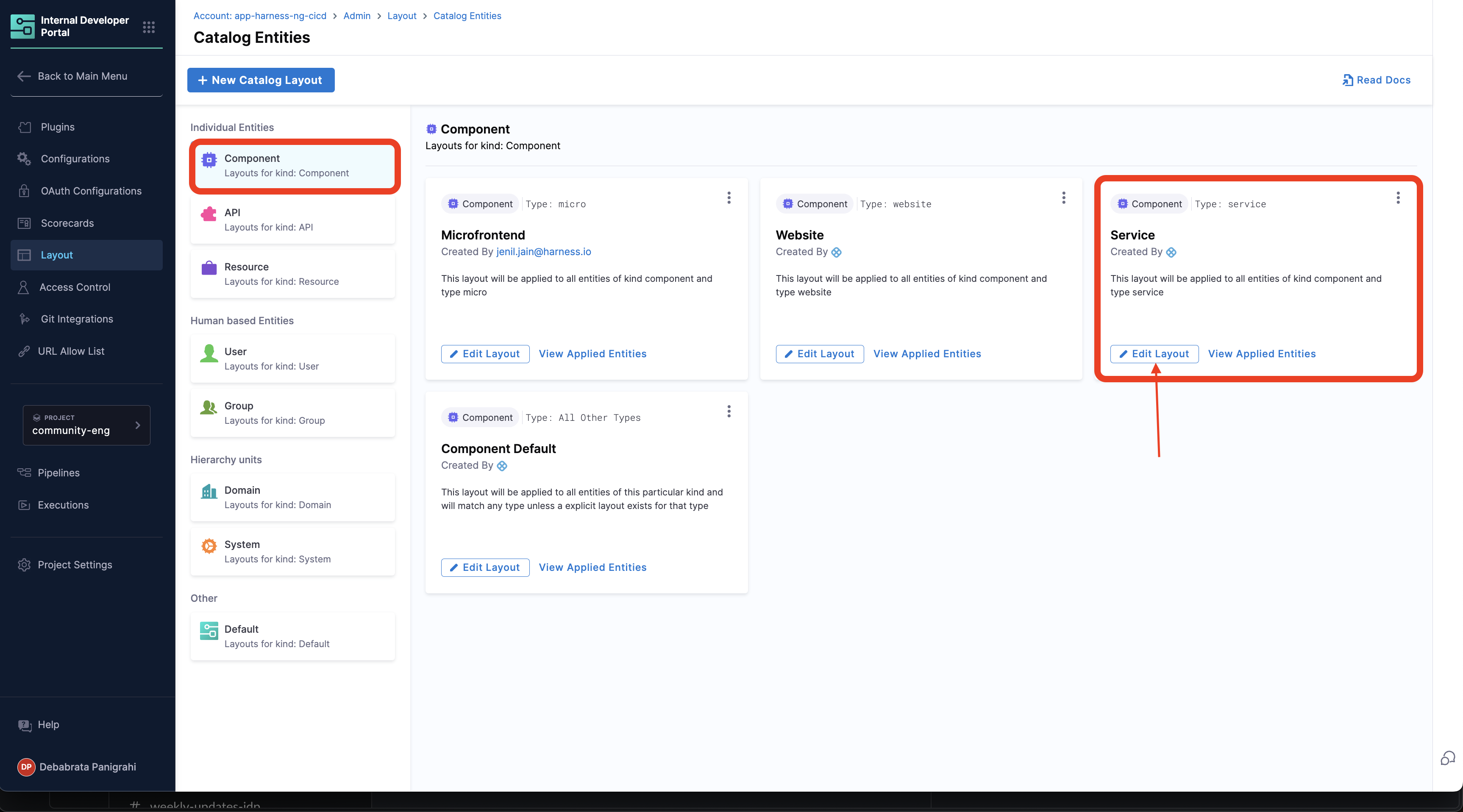 . For example, the first layout in the screen will match any Catalog entity with kind: Component