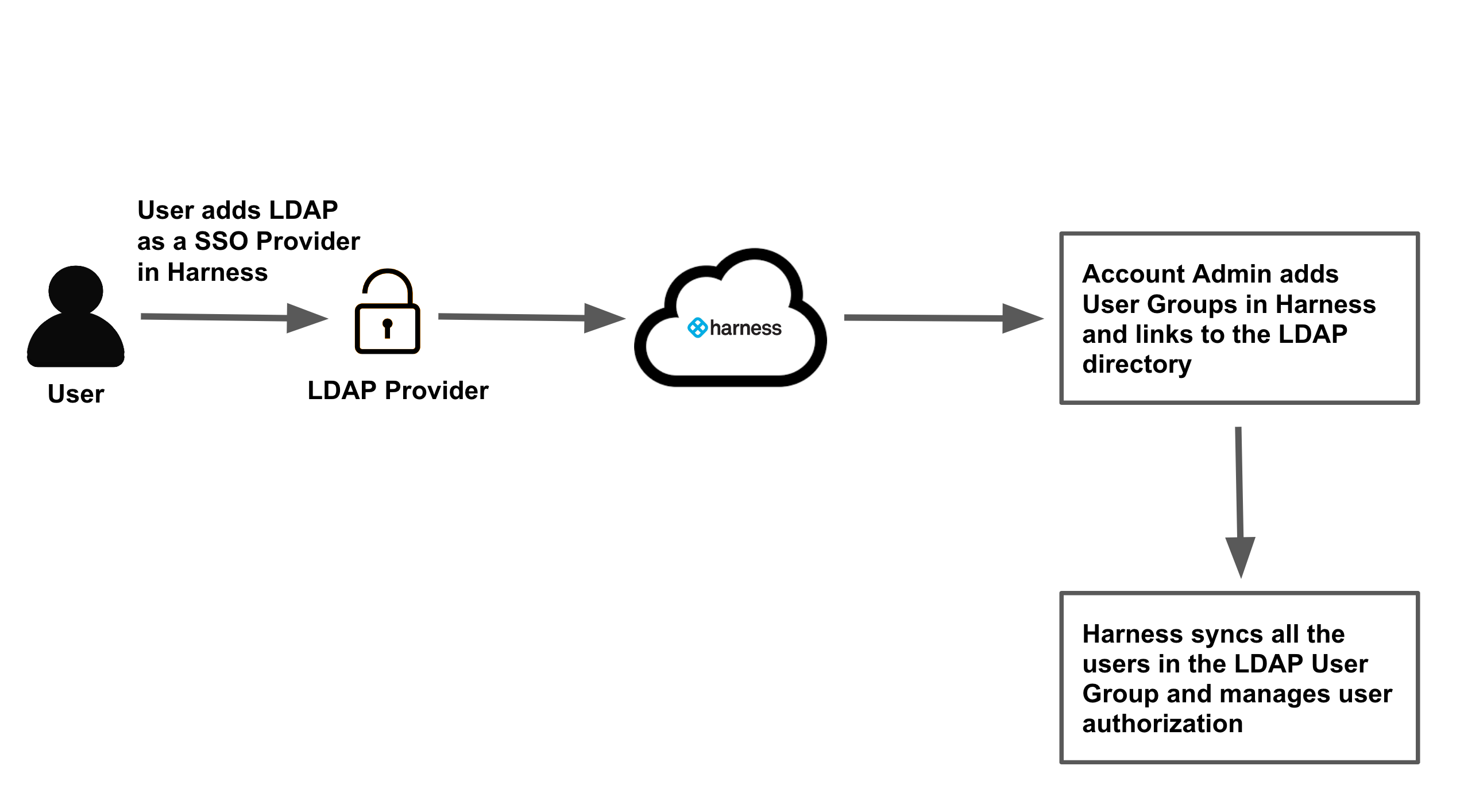 Adding your LDAP Provider to Harness initially involves establishing a connection from Harness (specifically, the Harness Delegate) and querying your LDAP directory for the users and groups you want to sync with Harness for SSO.