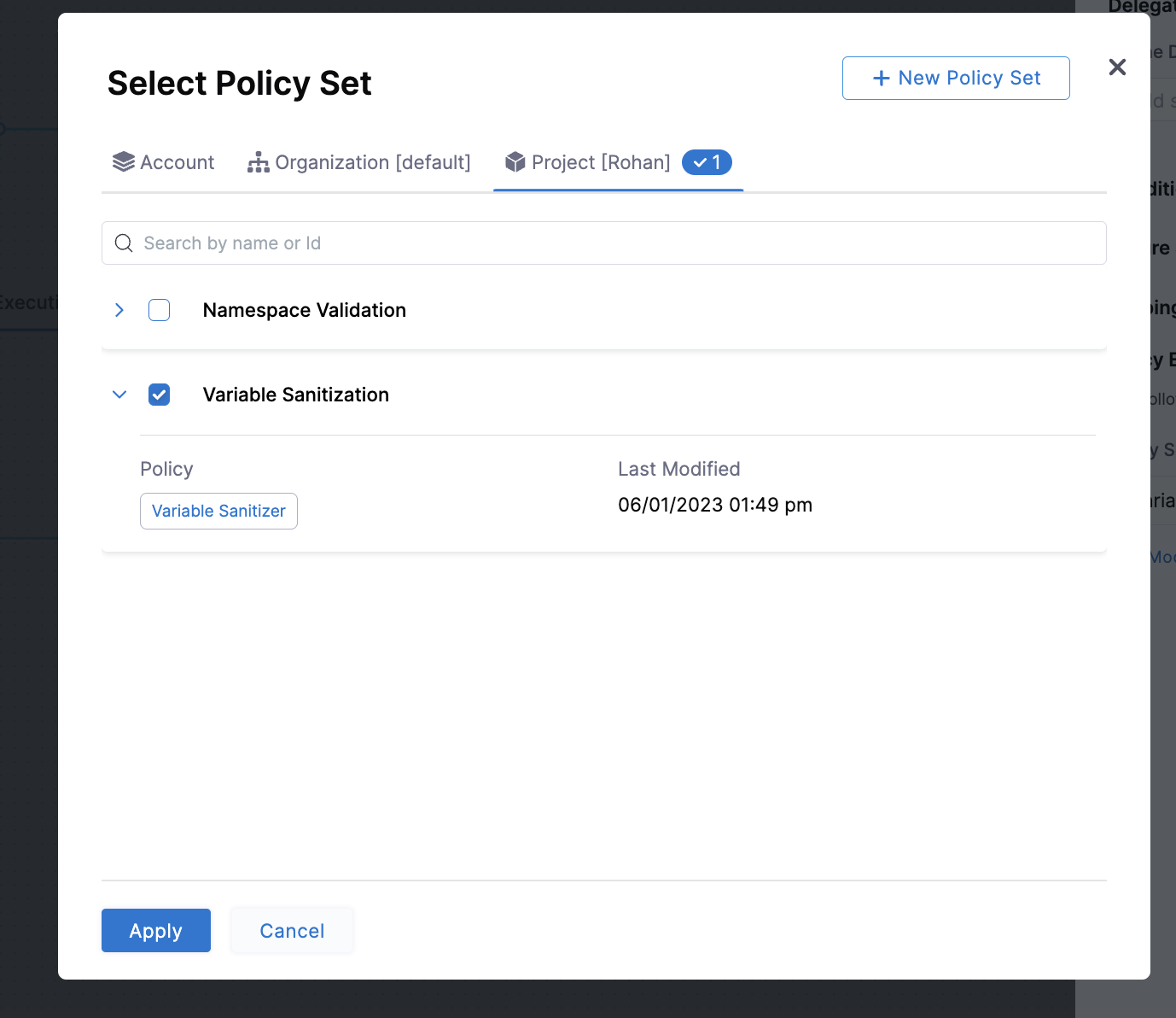 - Add a policy set to a step in the pipeline