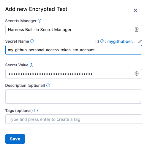 1. Specify the Secret Name and Secret Value (your GitHub access token). It's good practice to indicate the scope of the secret in the name, as shown in this example.