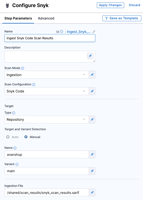 - Ingestion mode: In this mode, the Snyk step reads scan results from a data file, normalizes the data, and deduplicates it.
