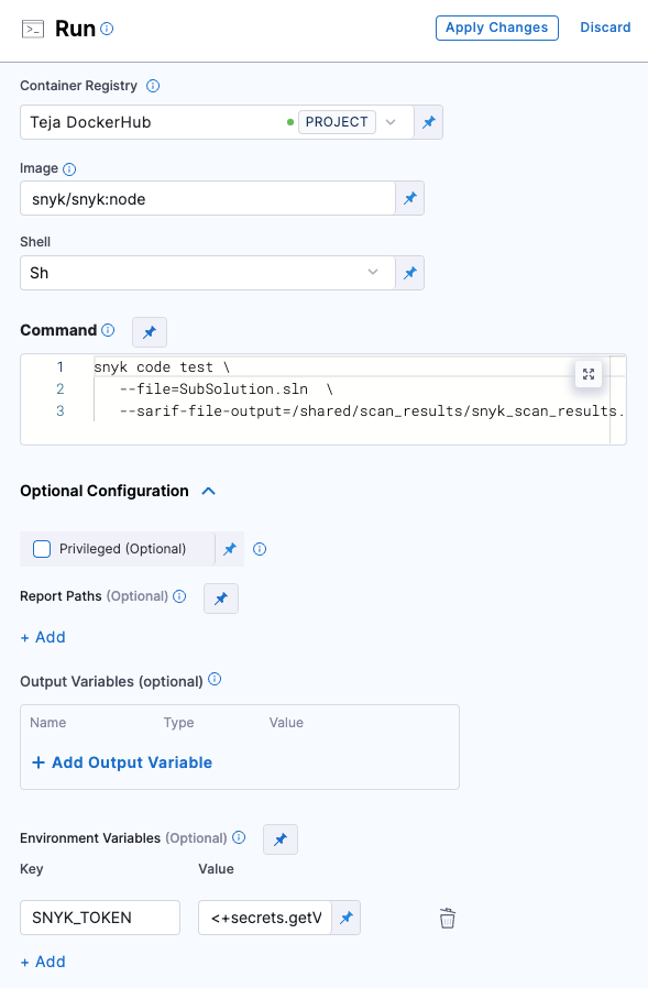 In Optional Configuration, under Environment Variables, add a variable to access your Snyk API key: