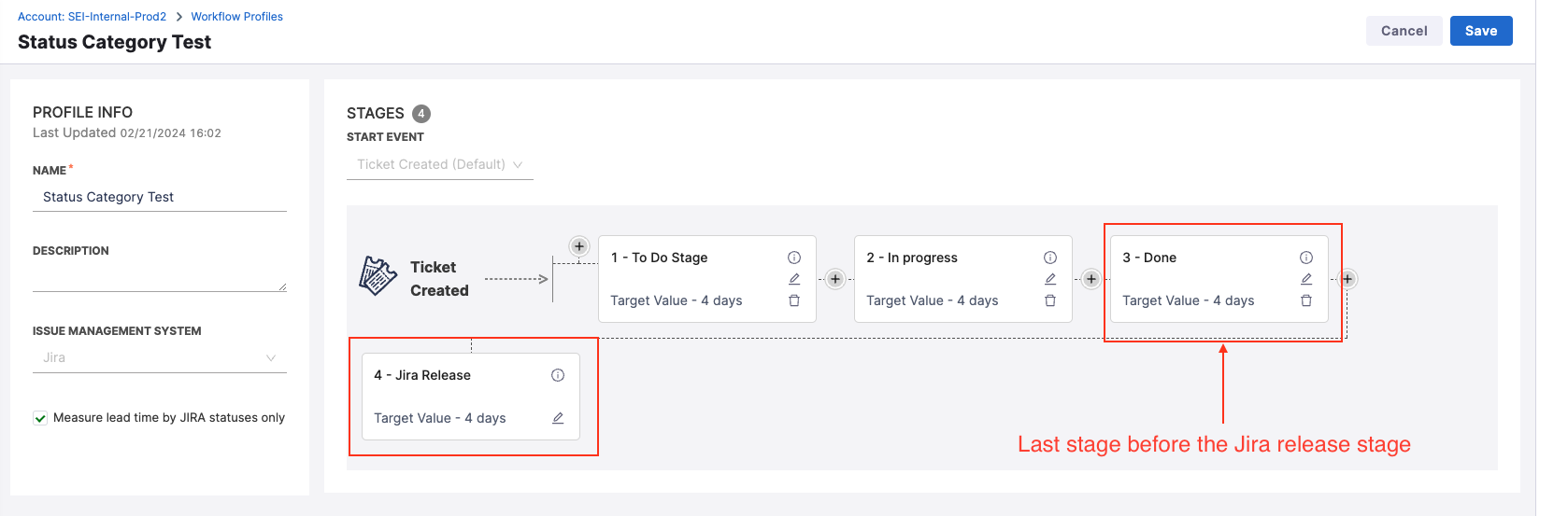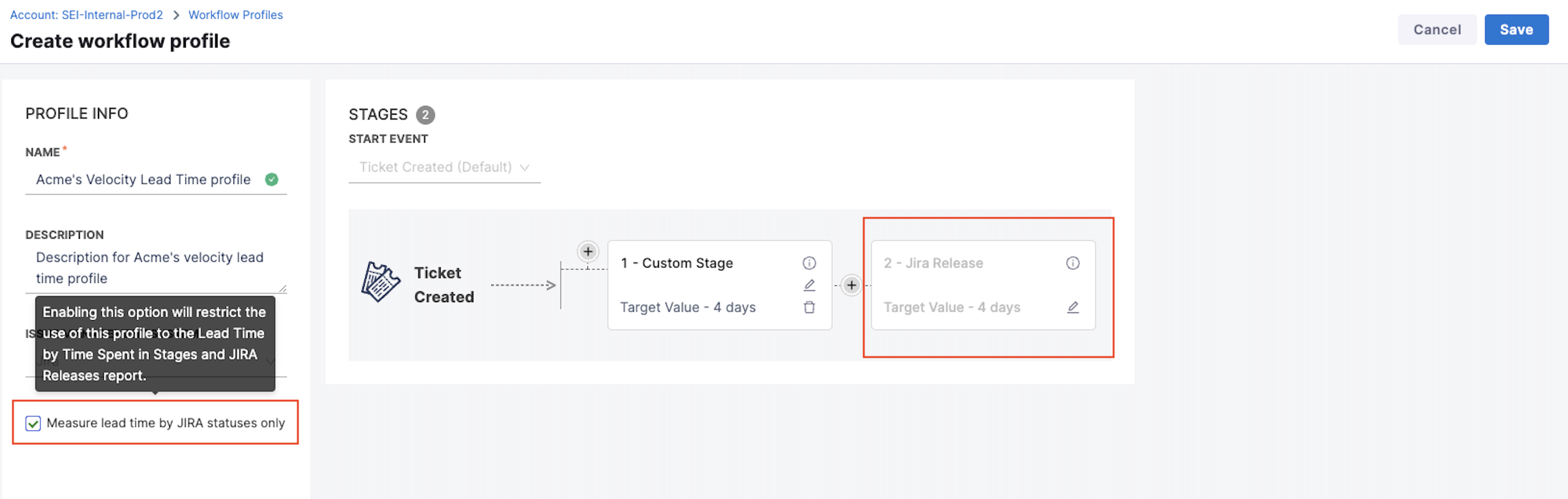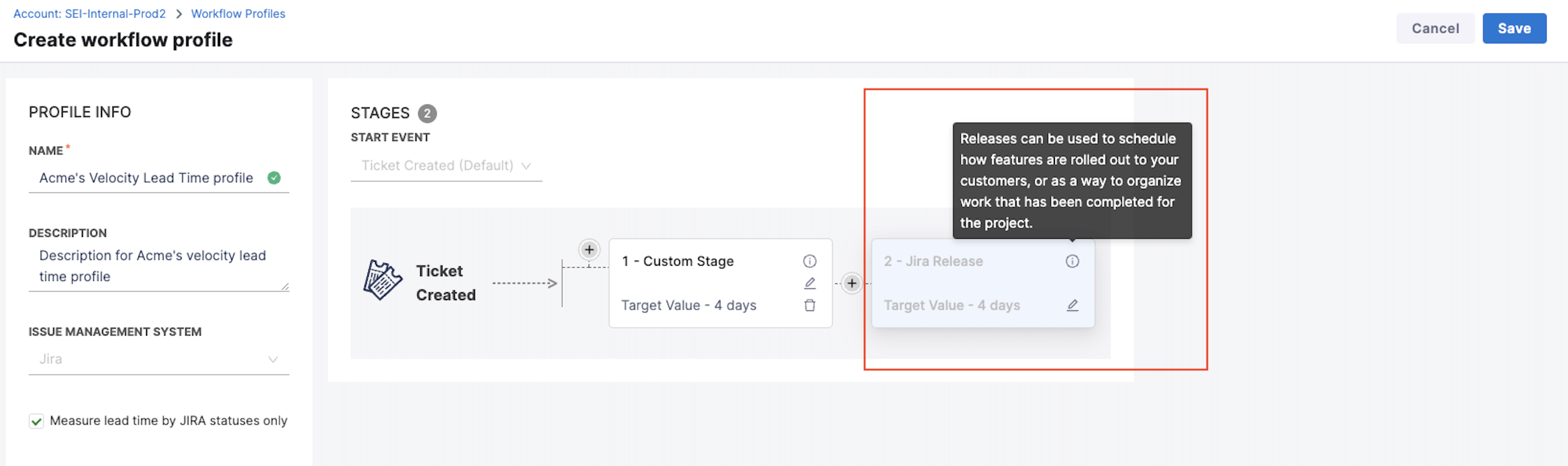 • For new profiles, the release stage is disabled by default. Enable it by selecting the checkbox to measure lead time using Jira statuses.