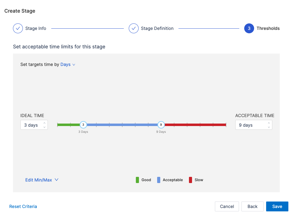 • Set acceptable time ranges for the stage, such as Ideal Time and Acceptable Time.