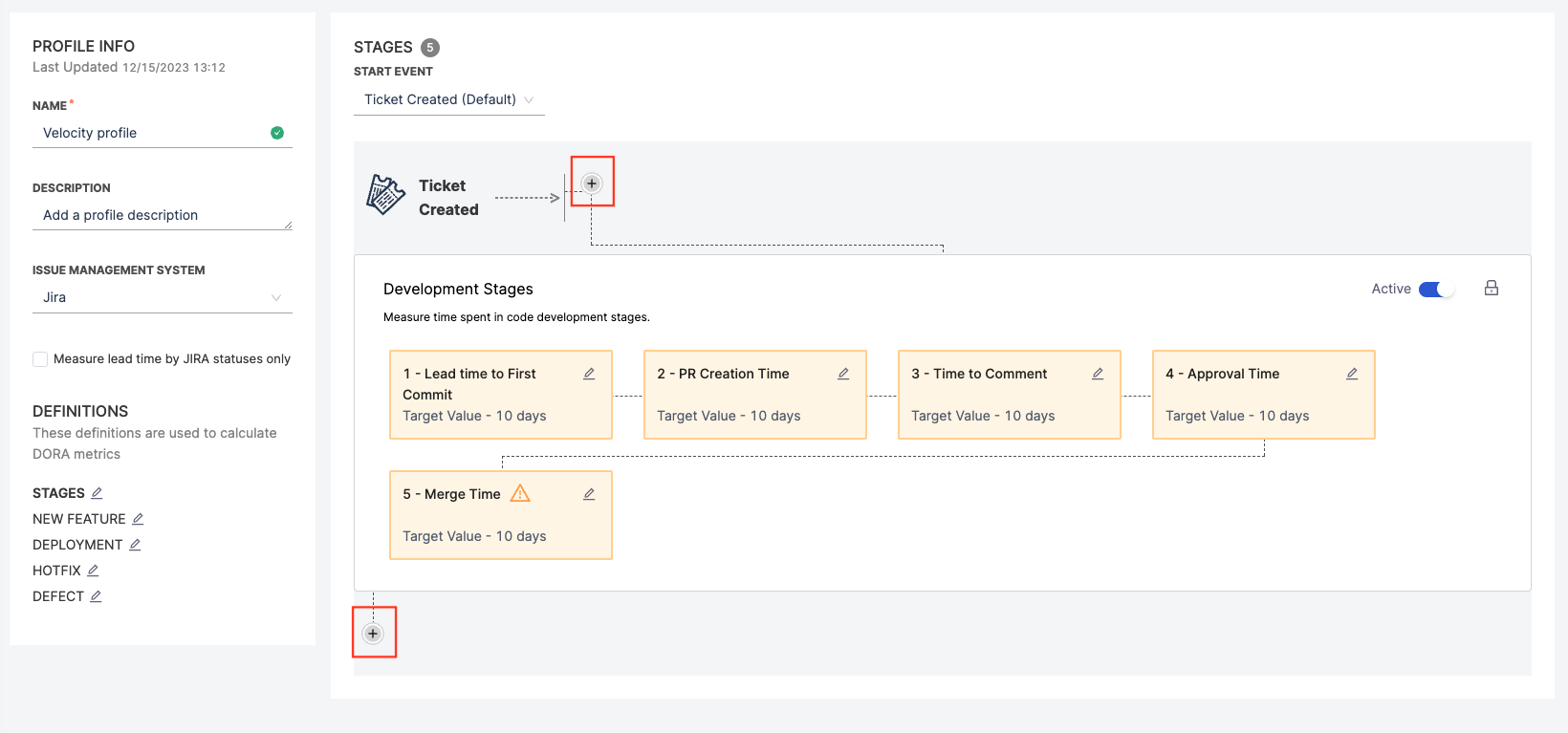 6. To track progress in your issue management tool, select the + icon to add stages before and after the Development Stages. This allows you to track progress in both your issue management and SCM tools, from issue creation through code deployment.