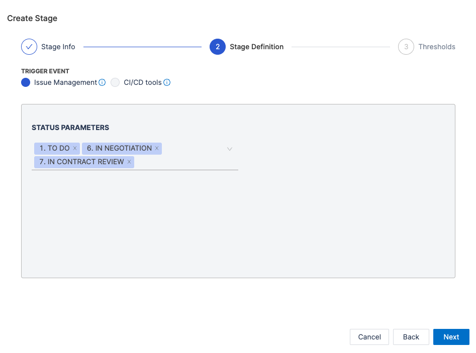 • Define the Stage Trigger Event (e.g., Issue Management) and map the stage to statuses in your issue management system.