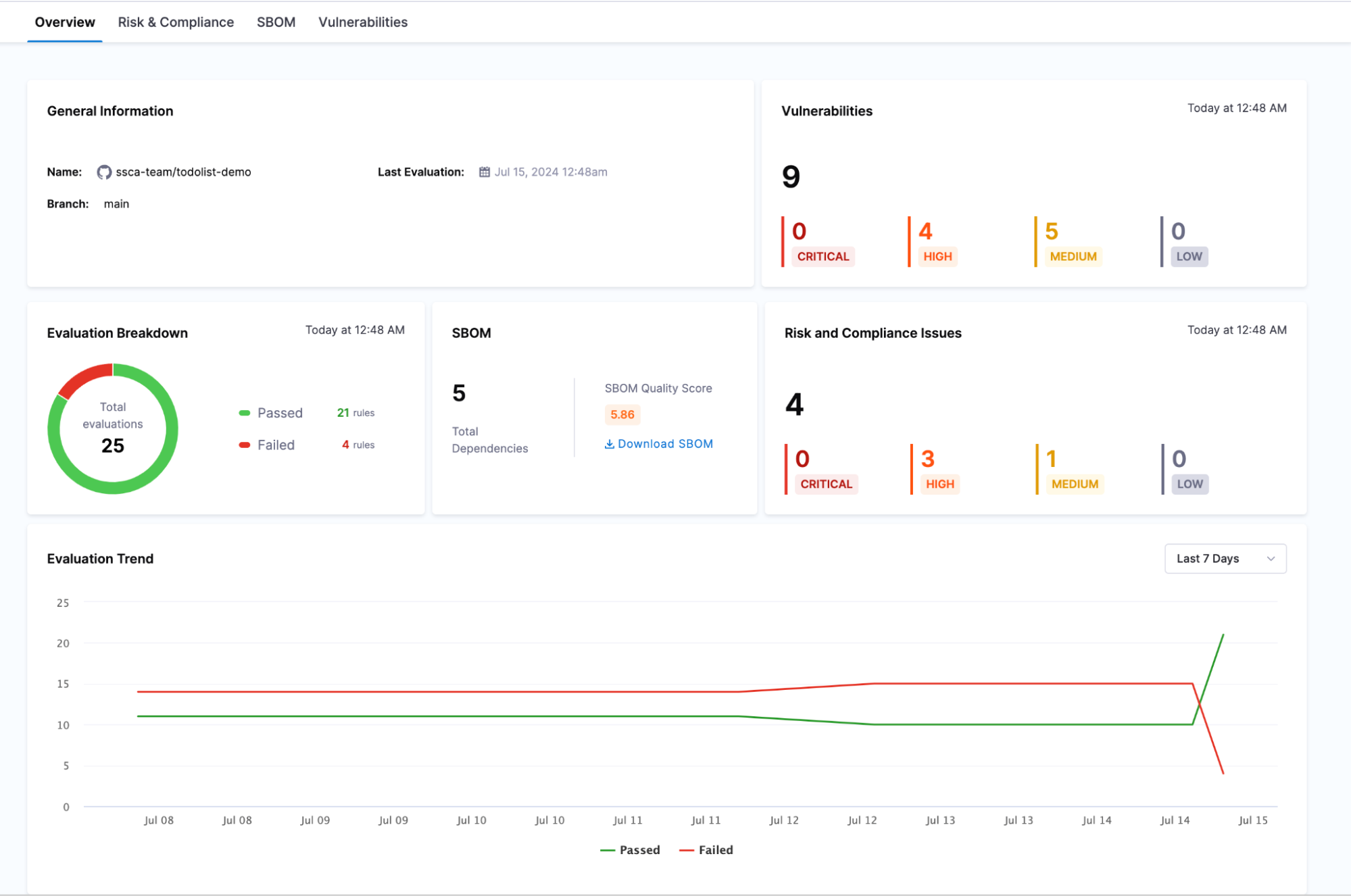 • SBOM: Presents the sum of all the dependencies with an SBOM quality score and an option to download the SBOM.